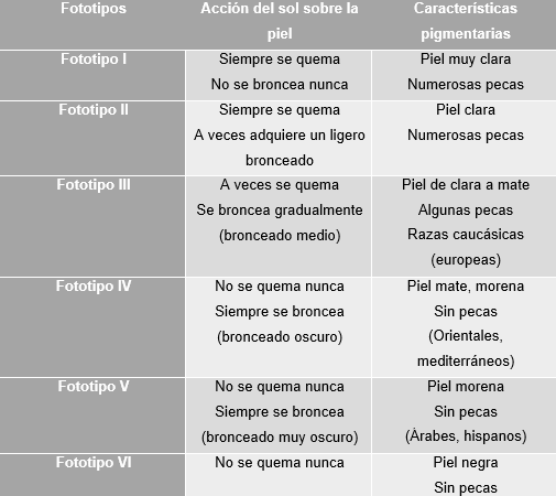 El fototipo es la capacidad de la piel para asimilar la radiación solar. Existen 6 fototipos y cuánto menor sea éste más alto tiene que ser el fotoprotector a utilizar.